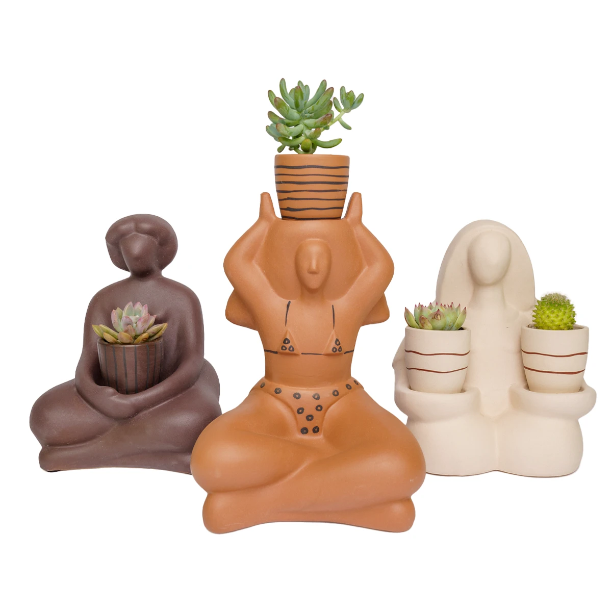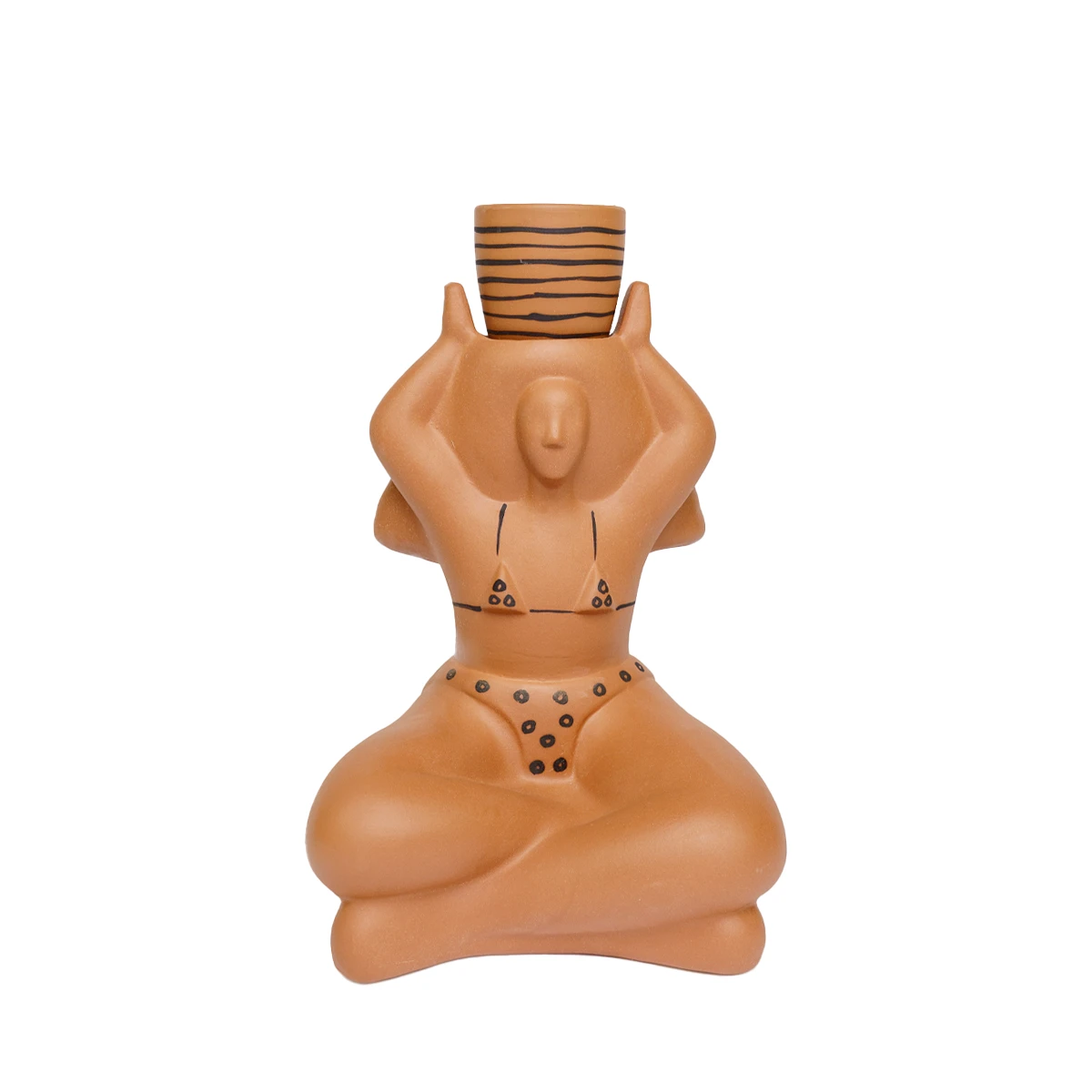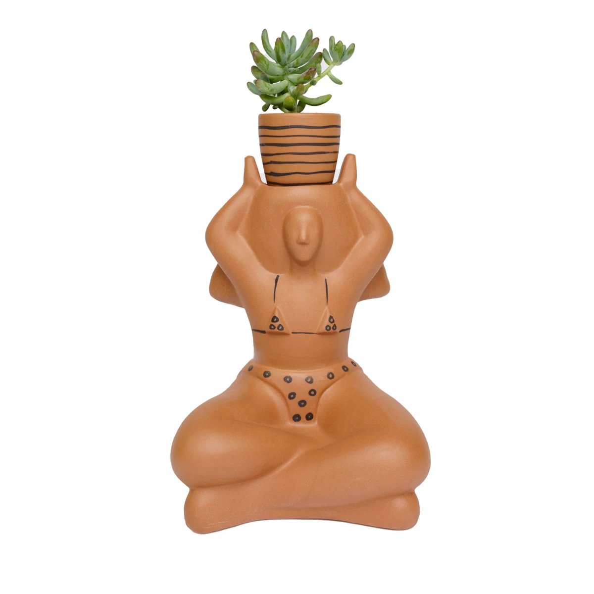 Found exclusively at Jungalow®, this sculptural ceramic planter is full of surprises. Our cheeky bikini-wearing gardener is an ode to fresh ideas and growth as she gracefully balances a plantie atop her head. Pop in some lush greenery, spare jewelry, matches, or anything else your heart desires for a secure & stylish storage vessel.