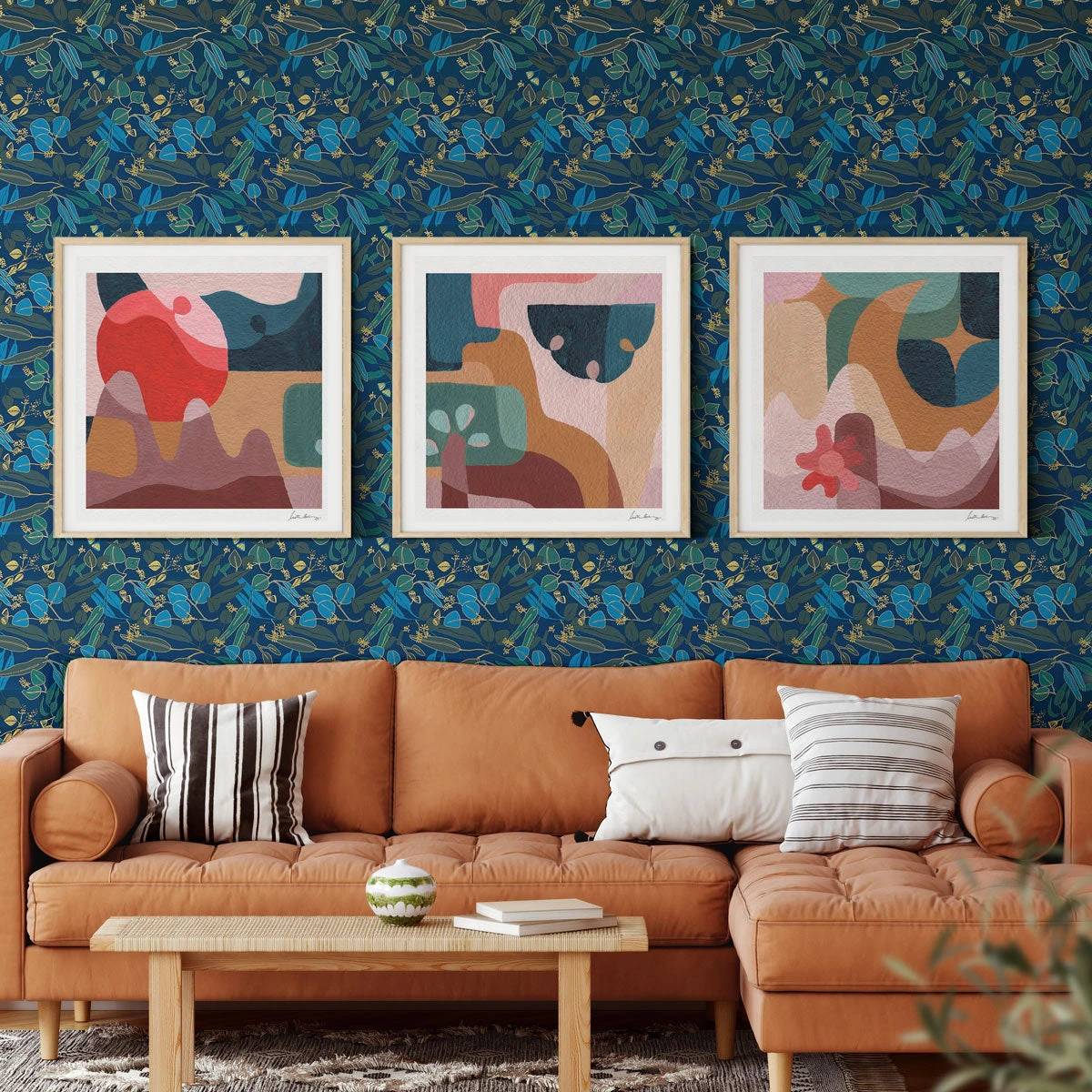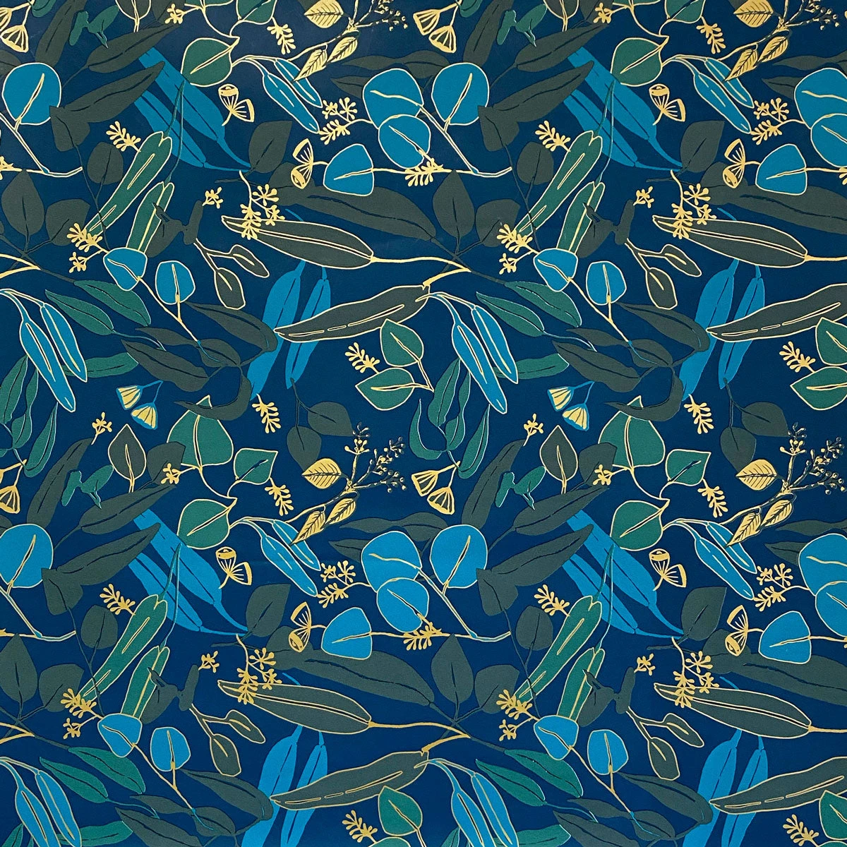 The cool blue and teal hues are balanced by the warm gold seeds and pods in this colorful wallpaper. This colorway is an ode to the cool, calm, serene effect from the eucalyptus scent. This design features a pattern made from Justina Blakeney’s original watercolor art and is found exclusively at Jungalow®!
