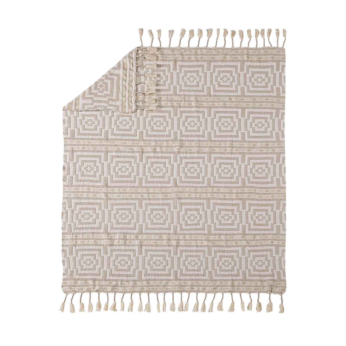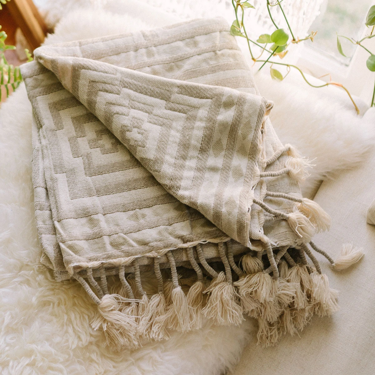 Our best selling Hypnotic pattern now comes in a mellow array of creamy hues, woohoo! This mesmerizing pattern is our bohotastic take on the classic Greek Key motif. This soothing neutral palette makes it easy to mix in wherever you desire. It’s extremely cozy and has a luxe feel – almost like chenille. We dig the unique tassels along the top & bottom and “unfinished” edges for a festive look and feel.